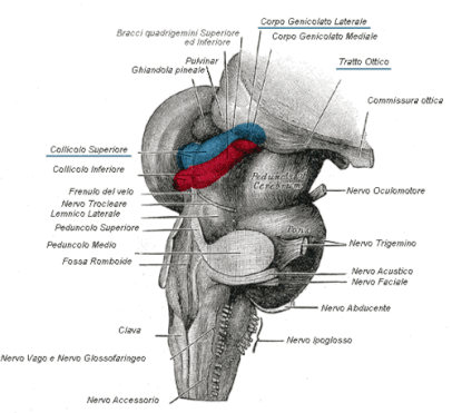 Nell'immagine qui a fianco è rappresentata la superficie posteriore del tronco dell'encefalo dopo asportazione del cervelletto. In blu è possibile apprezzare superiormente il corpo genicolato laterale e inferiormente il collicolo superiore; quest'ultimo è un importante stazione mesencefalica corrispondente al tetto ottico dei vertebrati inferiori.