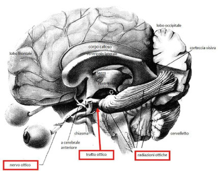 Dal chiasma ottico parte il tratto ottico, costituito da fibre maculari metà dirette e metà crociate, fibre nasali crociate, fibre temporali dirette. Il tratto ottico mette capo al corpo genicolato laterale del talamo, dove la maggior parte delle fibre termina. Dal corpo genicolato laterale del talamo originano fibre talamo-corticali che formano la radiazione ottica del Gratiolet, che passando nel braccio retrolenticolare della capsula interna e lateralmente al corno occipitale del ventricolo laterale giunge alla corteccia cerebrale dei labbri e del fondo della scissura calcarina, sede dall’area ottica primaria nel lobo occipitale.