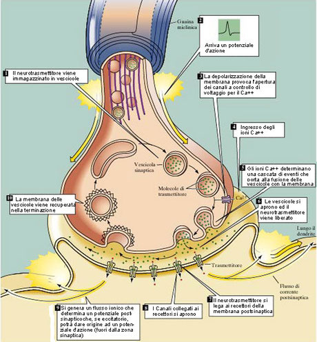 Quando l’impulso giunge al termine dell’assone, provoca l’apertura delle proteine canale degli ioni calcio Ca++ nel rigonfiamento terminale, chiamato bottone sinaptico. Gli ioni calcio sono presenti in concentrazione maggiore all’esterno della cellula e passano quindi all’interno. Questo evento induce l’esocitosi delle vescicole contenenti i neurotrasmettitori, che attraversano lo spazio sinaptico e si legano alle proteine di membrana (recettori) del neurone post-sinaptico. Il legame provoca l’apertura di canali ionici, permettendo l’entrata di ioni nel neurone post-sinaptico, provocandone la depolarizzazione e dando l’avvio all’impulso nervoso.