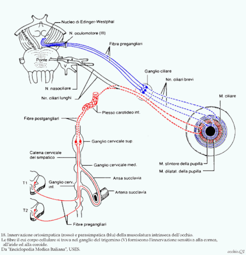 l riflesso di costrizione della pupilla è un riflesso mediato dal sistema parasimpatico molto importante indagato nella pratica clinica neurologica, utile affinché il soggetto non venga abbagliato prima che entrino in atto tutti i processi di adattamento descritti precedentemente. Una luce intensa è in grado di provocare questo riflesso innescando un processo che ha come sede principale i nuclei del pretetto. Questi proiettano assoni verso il nucleo di Edinger-Westphal (o nucleo oculomotore accessorio), un piccolo nucleo parasimpatico posto nelle immediate vicinanze del nucleo oculomotore. Il nucleo di Edinger-Westphal proietta assoni pregangliari verso il ganglio ciliare. È importante notare che queste fibre pregangliari "viaggiano insieme" al nervo oculomotore fino al ganglio ciliare. Dal ganglio ciliare si originano i nervi ciliari brevi, fibre parasimpatiche postgangliari che stimolando il muscolo costrittore della pupilla ne provocano la contrazione.