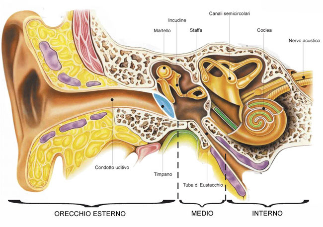 1. L’orecchio esterno raccoglie i suoni e li convoglia verso l’orecchio medio. Esso è composto dal padiglione auricolare, la parte che comunemente chiamiamo orecchio, e dal meato acustico o condotto uditivo, lungo 2,5 cm, che convoglia le onde sonore contro la membrana timpanica che separa l’orecchio esterno dall’orecchio medio. Questa membrana – comunemente chiamata timpano – quando è sollecitata dalle onde sonore è in grado di vibrare e trasformare così il suono in un impulso meccanico.
