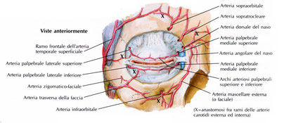 8 e 9) Arterie palpebrali superiore ed inferiore: provvedono alla irrorazione delle palpebre e danno indirettamente luogo, attraverso una rete arteriosa tarsale, alle arterie congiuntivali posteriori per la congiuntiva bulbare posteriore, palpebrale e dei fornici.