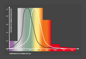 Per la visione fotopica tali valori sono rappresentati dalla funzione V(λ) (indicata nello schema seguente in bianco) che misura l’efficienza