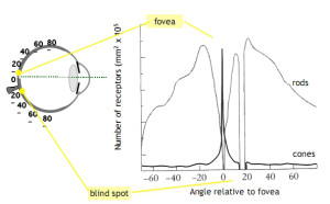 Nella figura a destra si osserva che, procedendo dalla fovea verso la periferia della retina, e quindi andando verso zone in cui la densità dei coni diminuisce drammaticamente,